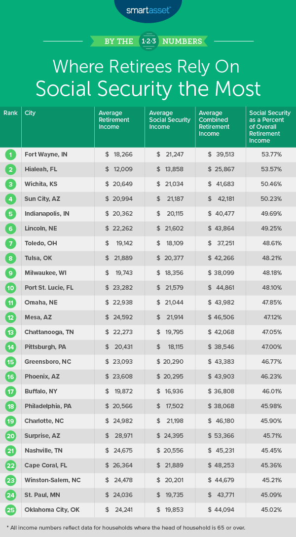Topping the charts of where retirees are most dependent on Social Security is Fort Wayne. In this city, average Social Security income equals $21,247, while total average retirement income equals $39,500. That means Social Security equals roughly 54% of income for the average retiree. The good news for the nearly 35,100 seniors in the area is the cost of living in Fort Wayne is relatively low. - Hialeah, Florida